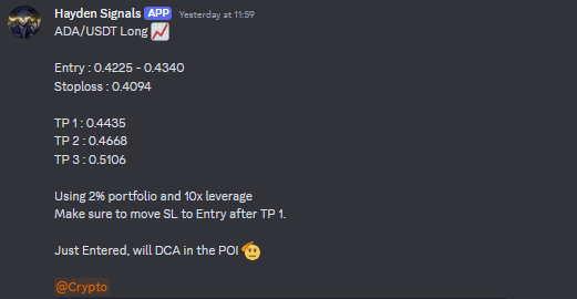 Hayden, one of our ace analysts at TradingLab, has just unveiled a promising trade in the ADA/USDT pair. Here's the scoop on his move: