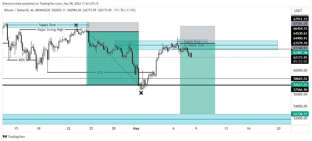 Key Levels: Sherlock emphasizes the H4 supply's crucial role, pointing to a bearish structure. Watching for a potential retest at $64,500, possibly dropping to $60,500 and down to $57,000.
