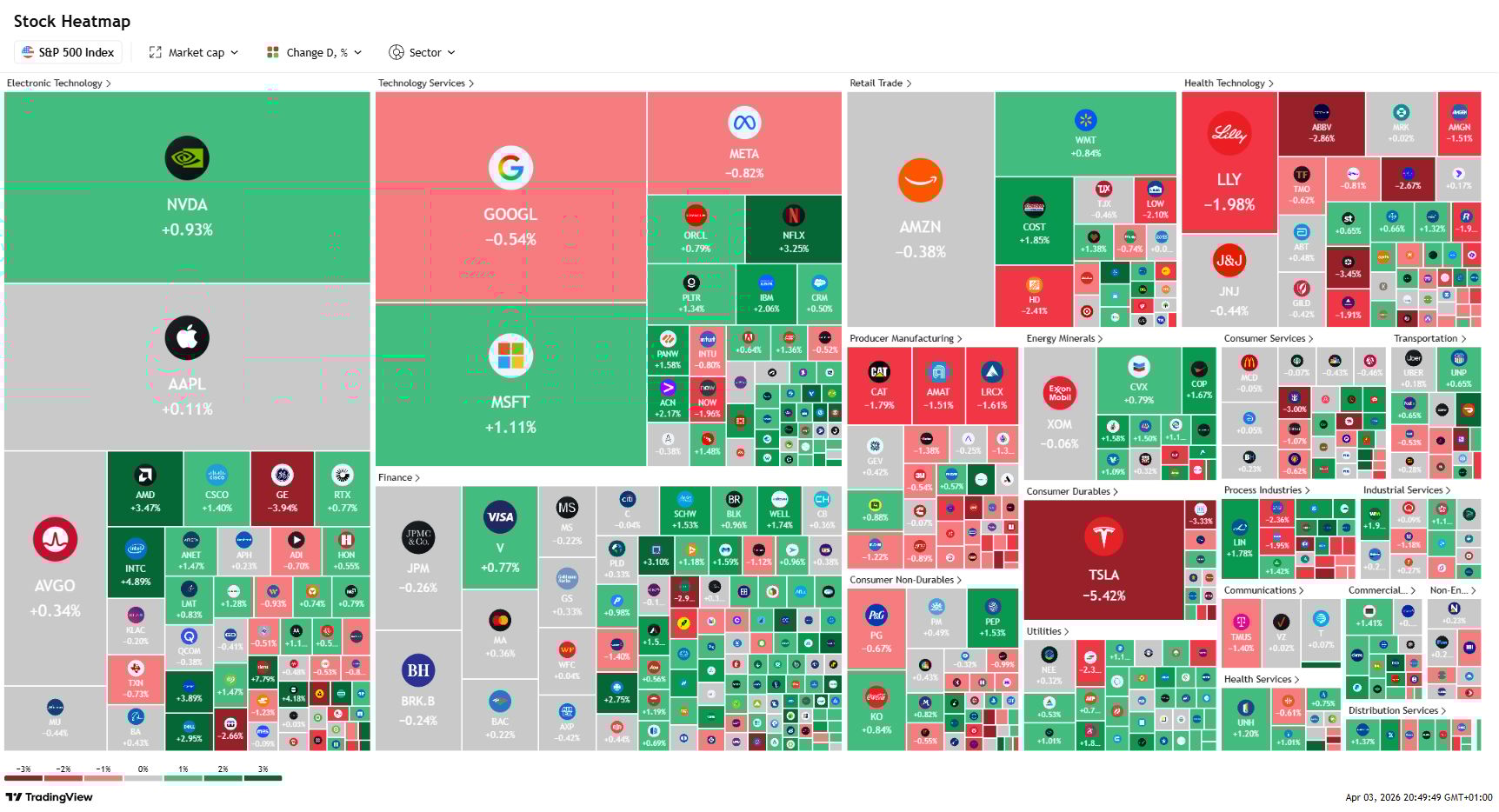 Tesla slides 5.5% on Q1 delivery miss - Q1 deliveries and production rose year-on-year but fell QoQ. Sentiment around the name remains fragile.