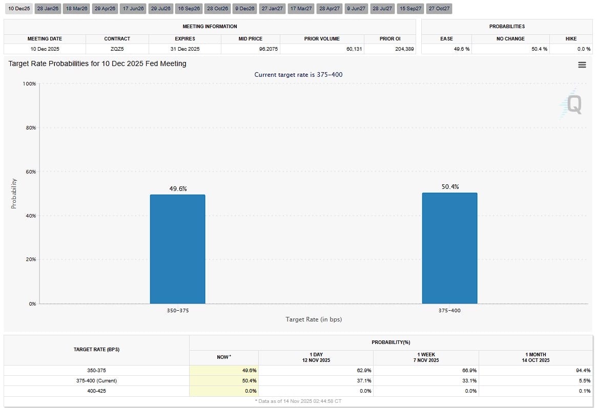 Uncertainty around the Fed isn’t helping. With the shutdown freezing key economic data, traders are flying half-blind heading into December’s meeting, and rate-cut odds have dropped to a coin flip.